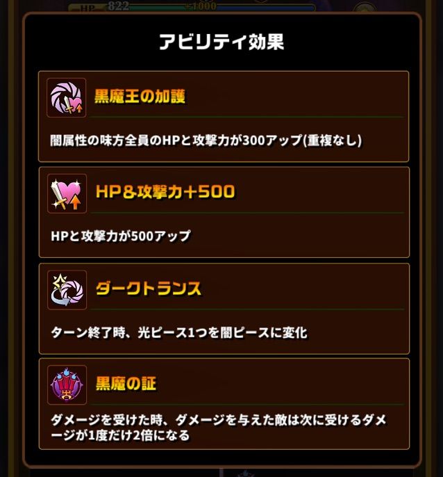 ダークトランスを持っているので他の闇ピース確保要因と合わせて変換を抜いたりする編成も可能です。闇属性のステータス大幅アップ!