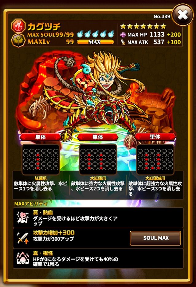 単体攻撃力は高めです。攻撃力もそこそこ高く、ソウルアビリティも攻撃力アップで、単体スキル攻撃で倍率もそれなりなので、単体アタッカーとして使えます。