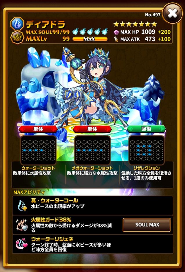 ウォーターリジェネ自体が非常に貴重なアビリティで、毎ターン終了後に盤面に残っている水ピース1つにつき、HPの1%を回復できます。ウォーターコールとも相性がよく、1体入れるだけで安定感がグッと増します。