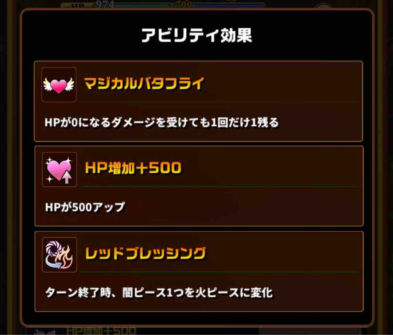 とても貴重なトランス系アビリティを持ちます。通常、火ピースは木ピースを変換元とするのですが、バレンタインエーディンは闇ピースを変換します。
