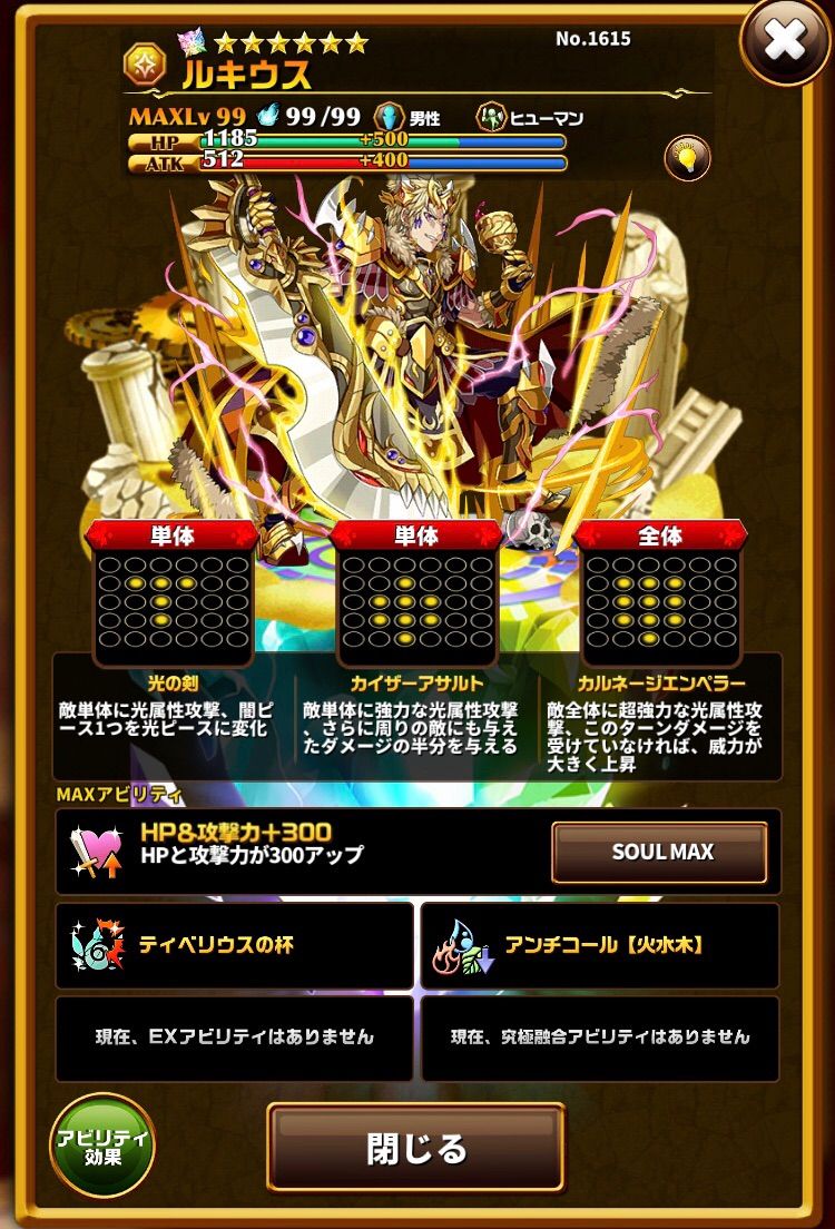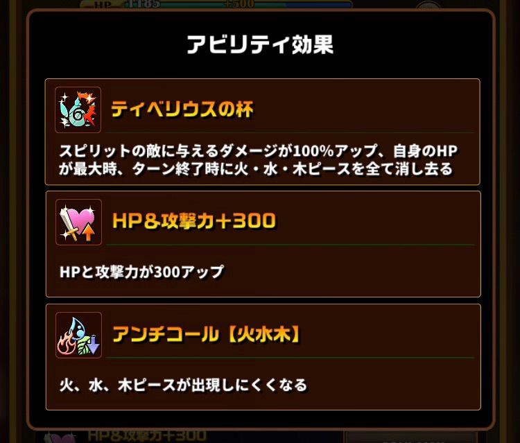 HP最大維持が大変以前のようにスキル発動で火水木ピースを吹き飛ばせていたら強力だったのですが、ターン終了時にHP最大の維持が条件となってしまい、発動が難しくなってしまいました。