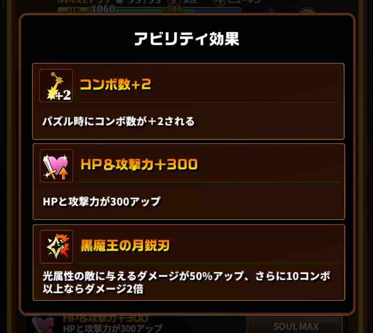 これも加護シリーズ共通ですが、光属性に対して攻撃力が50%UPします。普通はアビリティによる強化同士は加算されるのですが、ヴァニラの10コンボで攻撃力2倍のアビリティと光属性キラーは乗算関係になっており、光属性に対しては3倍の攻撃力になります。