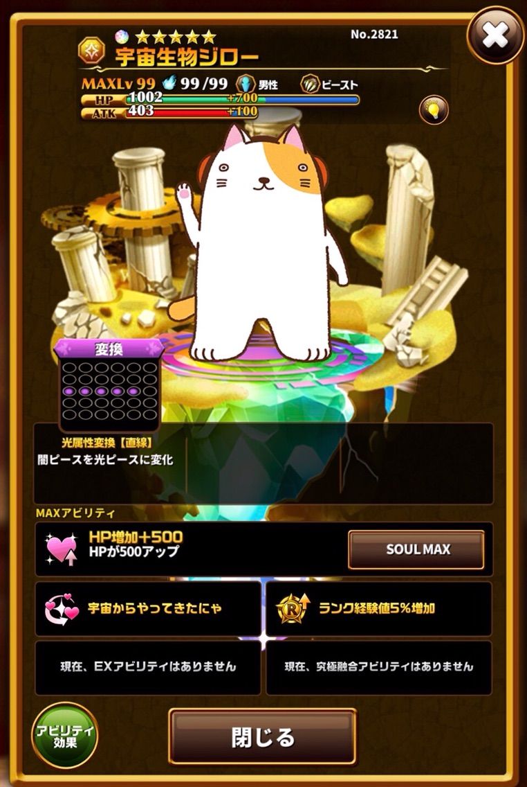 しかし、★5でHPアップがついているので耐久力はなかなかの物があり、★5の変換を手に入れるまでの間などは使い勝手が良さそうです。
