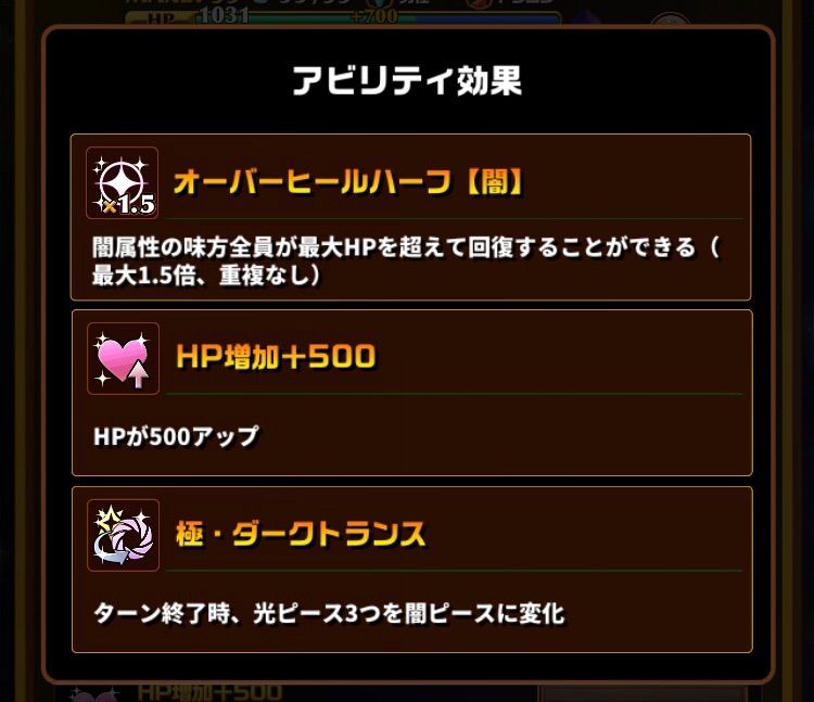 アビリティ「極・ダークトランス」毎ターン終了後にピースを3つ変換する極トランスを持っています。