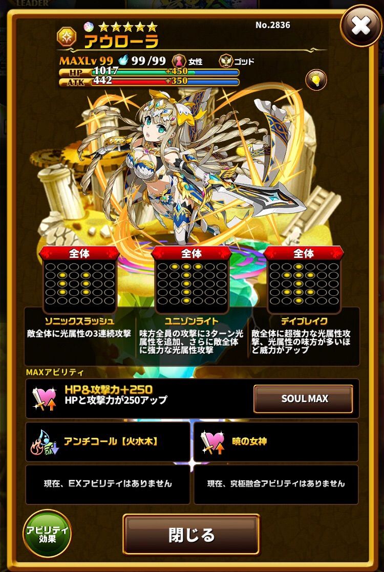 アウローラは光属性PTを組むので全く意味がなく、使い所が不明なスキルです(今の所)。