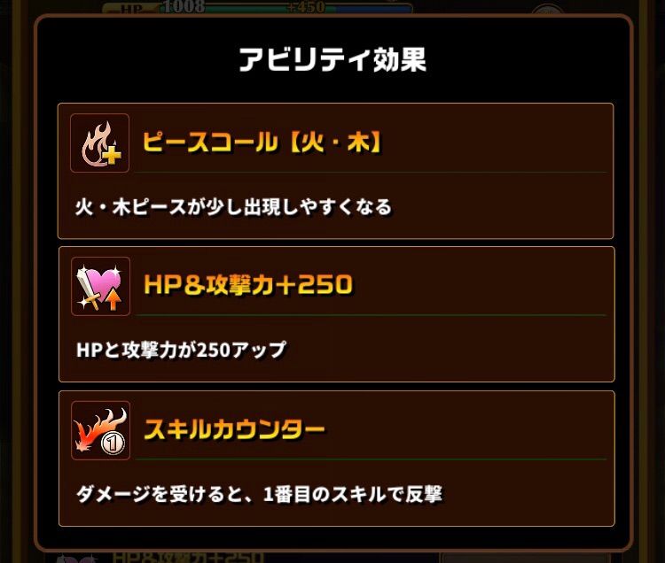 スキル1によって火ピースと木ピースが落ちてきやすくなります。