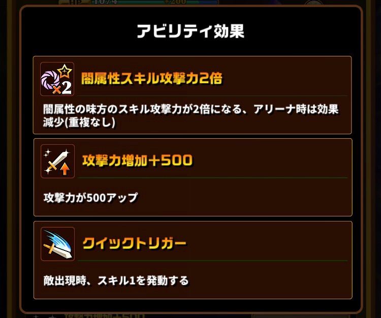 アビリティ「闇属性スキル攻撃力2倍」アビリティに闇属性スキル攻撃力2倍をもっており、名前の通りPTの闇属性のスキル攻撃力が2倍になります。