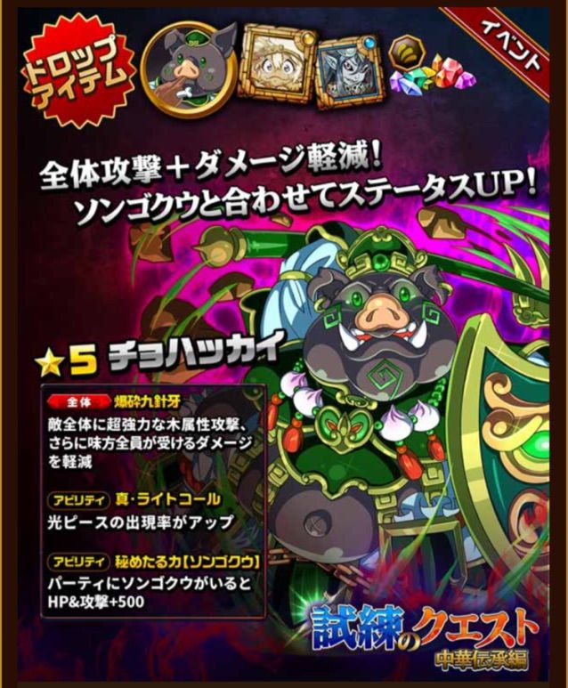 チョハッカイは「★5チョハッカイの試練(高難易度)」をクリアすると確率でドロップする試練モンスターです。
