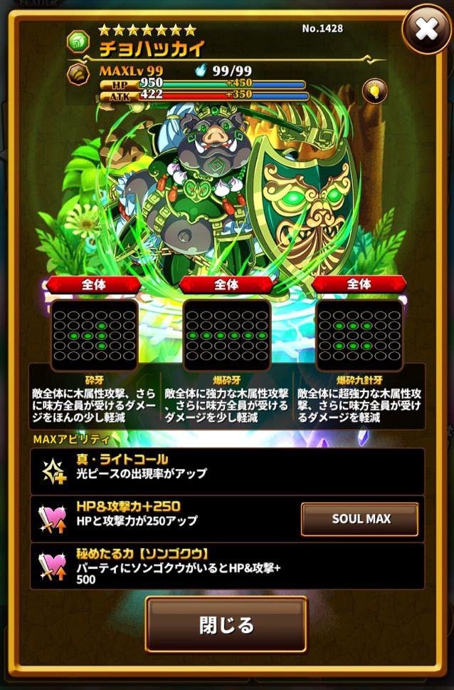チョハッカイ自体は木属性ですが、光ピースを多く出現させる効果のあるライトコールを持ちます。これはソンゴクウと組ませることを前提としており、ソンゴクウが光属性でこちらもライトコールもちなので、一緒に使って行くことでより光ピースを多く出現させやすくなります。
