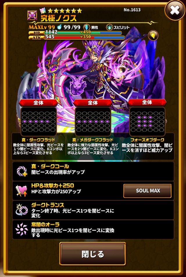 開始時に光ピースを1つ闇ピースに変えてくれます。スキルも変換能力があり、コンボ数が増えれば変換数も増えます。