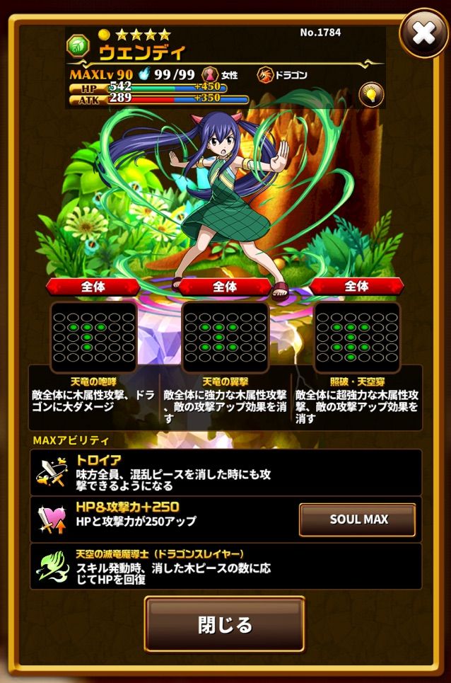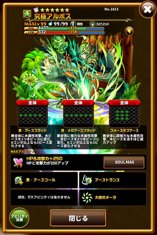 試練キャラのドゥルジが同じようなアビリティ&スキルをもっていますが、スキル1によってたった3つのピースで1.5倍ブーストに加えてさらに木ピースを盤面に6つになるように生成してくれます(6つ以上あるときは発動しない、6つ以上になるようにはならない)。スキルカウンターをもっているのでスキルを使わずとも敵からのダメージをうければカウンターで発動できる上に、スキル3を発動中でもスキル1は発動します。